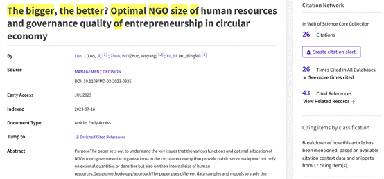 近日,由我院卓武扬教授团队发表在国际顶级SSCI期刊《Management Decision》关于绿色经济的论文---《The bigger, the better? Optimal NGO sizeof human resources and governance quality of entrepreneurship in circulareconomy》---同时成功入选最新一期的ESI热点(1‰)和高被引(1%)论文。本文研究了我国绿色经济下NGO规模与地区治理水平的关系,对于新时期建设美丽中国,以高品质生态环境支撑高质量发展具有理论启发意义。这是我校经济学科第一篇ESI热点和高被引论文,实现了我校人文社科类专业科研发展新的突破。