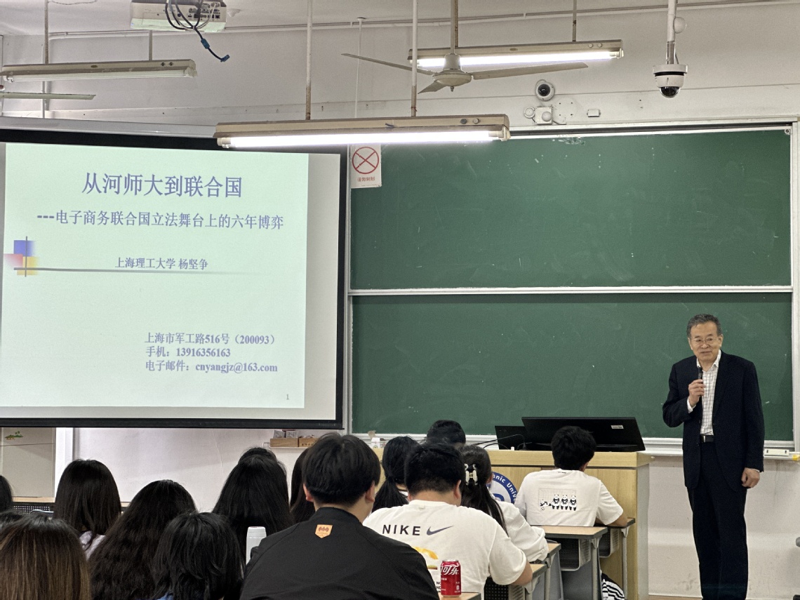 2024年5月24日,上海理工大学杨坚争教授应邀为经管学院电子商务专业2023级本科生做导论讲座,讲座的主题为《电子商务联合国立法舞台上的六年博弈》。