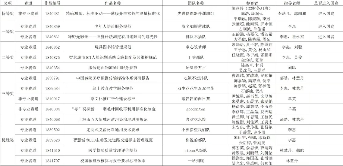 获得特等奖的团队来自经管学院的“先进储能器件课题组”,获得一等奖的团队来自经管学院的排队不插队“取名如履薄冰队”。在标准化工程专业老师们的悉心指导下,参赛学生反复打磨参赛作品,最终进入国赛决赛,期待晋级决赛团队的精彩表现!