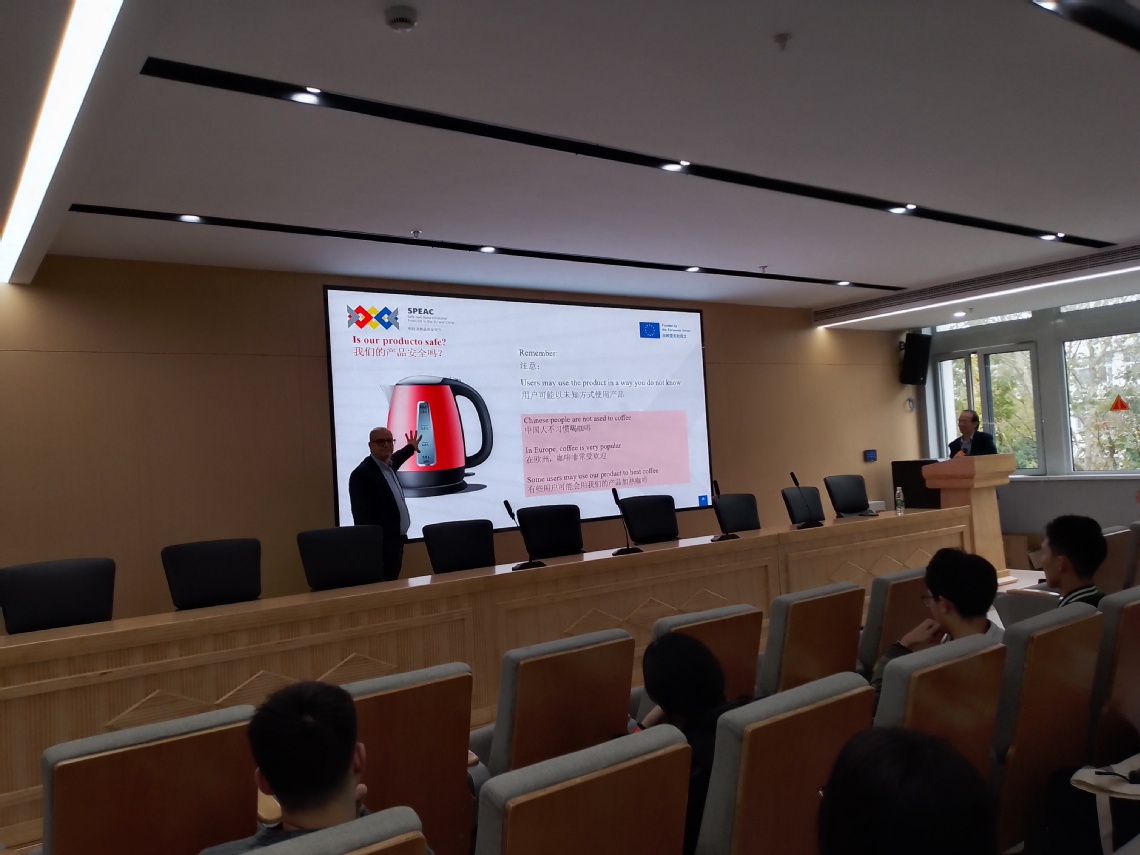 座谈会后,VERDERA MARI, FranciscoJavier与刘开明博士共同为学生们做了一场关于“欧盟产品安全法规和标准体系介绍”的精彩报告。报告中,两位专家结合中欧在产品安全领域的实际案例,深入剖析了产品安全的重要性和挑战,就如何提升产品安全水平给出了具体建议,并介绍了从事产品安全领域工作应该具备的必备技能。报告内容深入浅出,既有理论高度,又贴近实际,赢得了在场学生的热烈掌声。