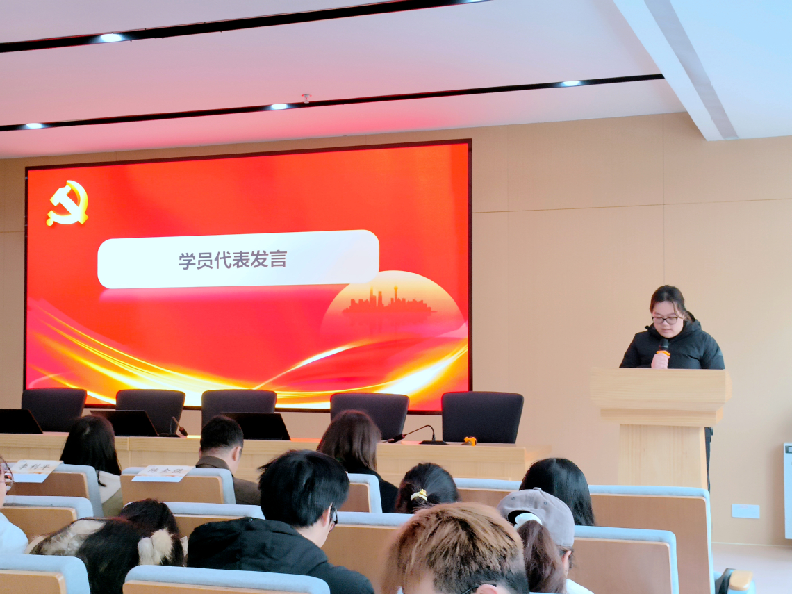 随后,学员代表黄悦发言。她回顾了在培训班期间的学习历程,从党的理论知识学习到实践活动参与,深刻体会到了作为一名入党积极分子的责任与使命。表示将以此次培训为新起点,进一步坚定理想信念,加强党性修养,在学习、生活和工作中时刻以党员标准严格要求自己,积极传播党的声音,为学院和班级建设贡献更多力量。