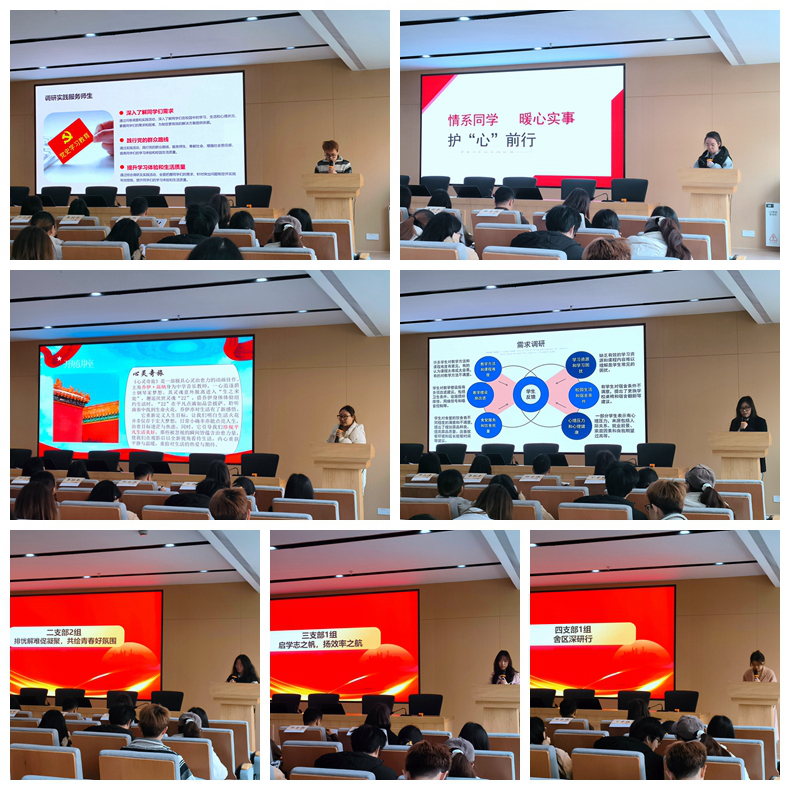 仪式伊始,进入“情系同学,暖心实事”汇报展示环节。培训班七组学员代表依次上台,分享他们在实践活动中的精彩成果与深刻感悟。一支部1组的钟亚君介绍了“携手共筑学习梦”项目,通过多种学习互助形式,助力同学们提升学业成绩;一支部2组程舒文展示的“心灵银幕守护站”,关注同学们的心理健康,以电影赏析等活动为载体,舒缓学习生活压力。二支部1组郭熙豪带来的“六级互助桥,学路并肩跑”,为备战六级英语考试的同学搭建起交流学习的平台;二支部2组王婕汇报的“排忧解难促凝聚,共绘青春好氛围”活动,聚焦于解决同学们在校园生活中的实际困难,增强集体凝聚力。三支部1组陈晓阳的“启学志之帆,扬效率之航”从学习方法与时间管理等方面着手,帮助同学们提高学习效率;三支部2组陈韵伊阐述的护‘心’前行”项目则进一步深化心理健康服务实践;四支部1组王心平展示的“舍区深研行”项目,深入学生宿舍,开展调研与服务,切实改善舍区环境与文化氛围。这些实践项目充分展现了入党积极分子们积极践行党的宗旨,全心全意为同学服务的精神风貌。