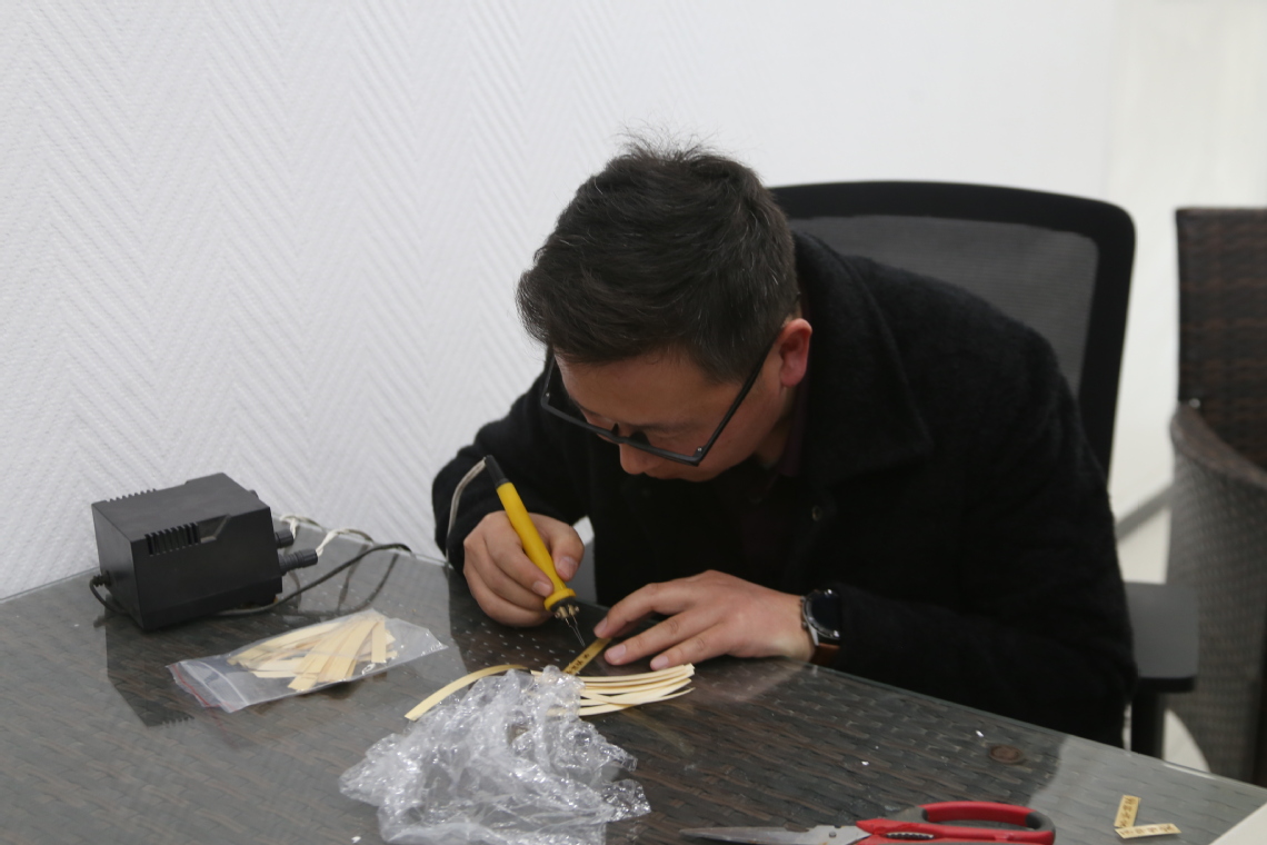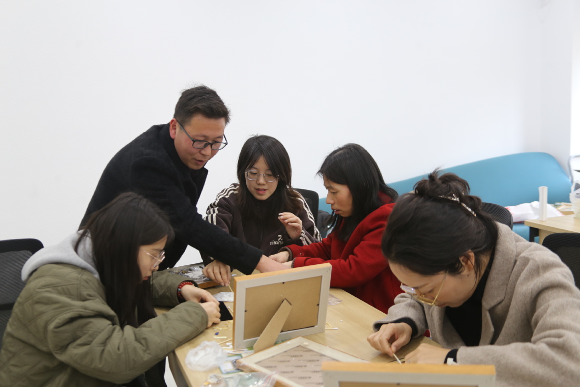 实践环节中,女教师以芦苇为媒进行主题创作。李辉联合学院青年创业团队特别准备了预处理的芦苇材料与环保黏合剂,通过粘贴、烙刻等技法,将"芳华传家"化作立体画卷。