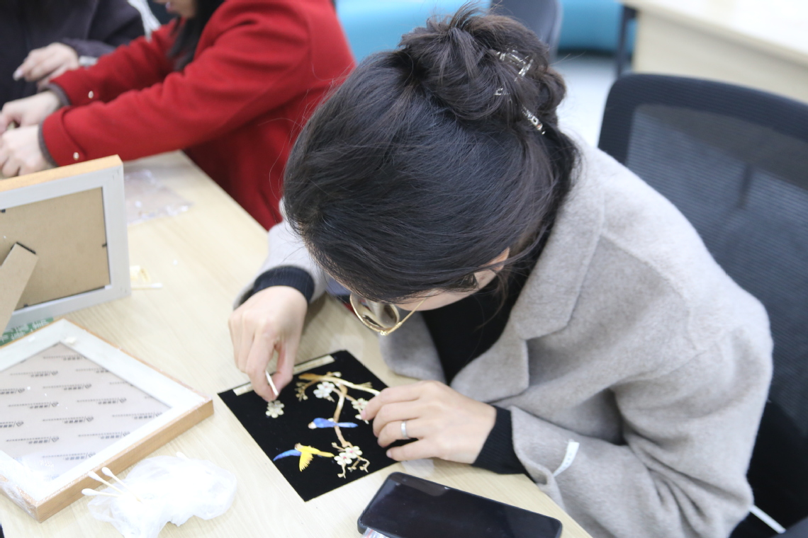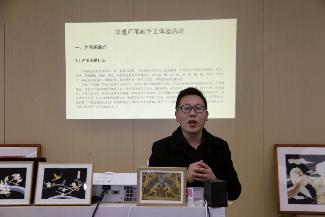 活动现场,非遗项目芦苇画技艺传承人、校友李辉带来芦苇画文化意义介绍和技艺教学。通过展示《梅兰竹菊》传统系列和《秦时明月》创新系列作品,生动阐释了海派芦苇画"以草为媒、化朽为奇"的艺术精髓。"每片芦苇都要经过选材、剖割、熨烫等12道工序",李辉手持特制烙笔现场演示,"温度控制是呈现明暗层次的关键"。