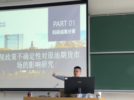 本次讲座的主题是“气候政策不确定性对原油期货市场的影响研究”,讲座伊始,邓嘉纬博士对气候政策、原油期货等核心概念进行解释,随后对目前研究成果的文献综述、气候政策不确定性对原油期货市场价格波动的实证分析等部分进行分享。在互动交流环节,邓博士针对投资黄金或股票提问互动,对风险厌恶以及风险偏好在原油期货市场上的表现进行了延伸,课堂生动有趣。
