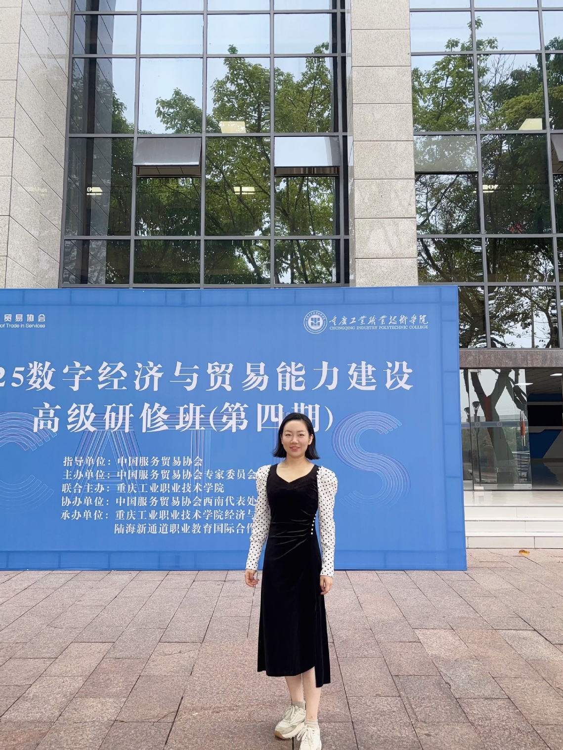 2025 年4月24日至27日,由中国服务贸易协会指导,中国服务贸易协会专家委员会主办,重庆工业职业技术学院等联合主办的 2025 年第四期数字经济与贸易研修班在重庆举办,吸引了来自各地方业务主管部门、产业园区、商协会、高校及研究机构等约 80 名专业人士参加。研修班邀请了多位行业知名专家授课,内容涵盖了构建全球数字贸易治理体系、数字贸易安全治理、数字经济与贸易人才能力建设等多个前沿领域。我院国际商务专业教师代表李奇璘参加此次研修,并顺利取得结业证书。