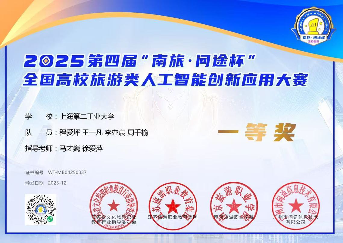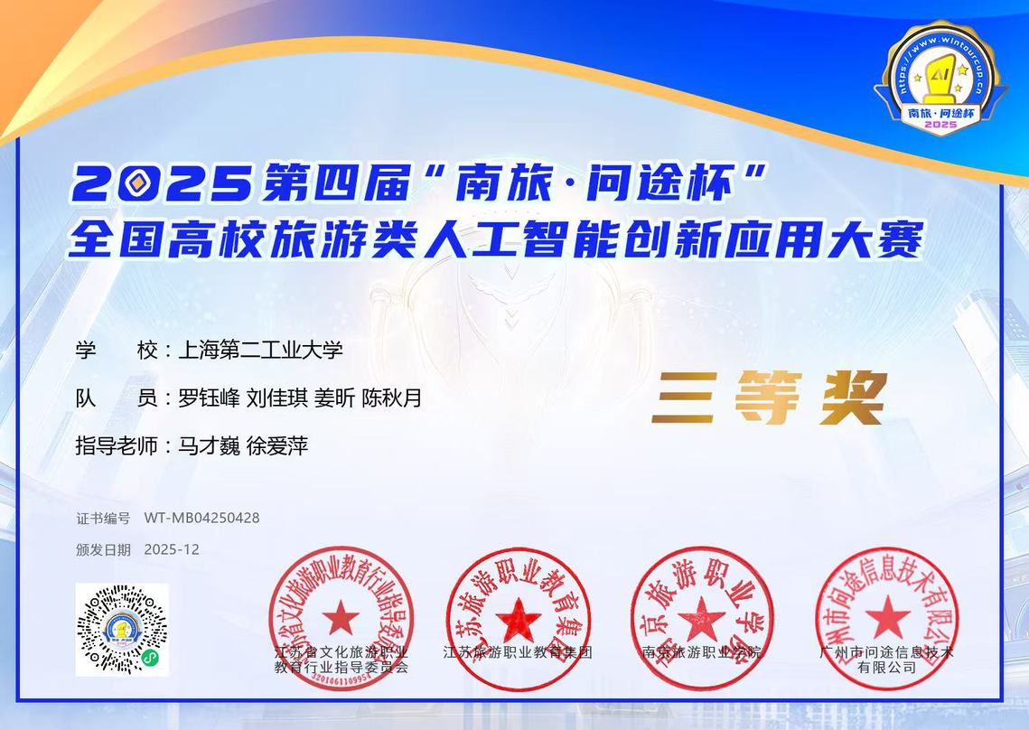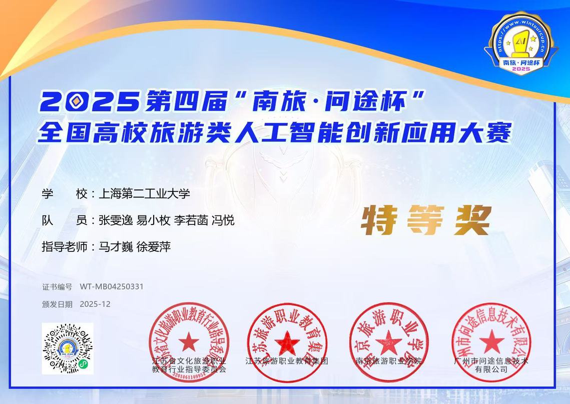 近日,2025年第四届“南旅・问途杯”全国高校旅游类人工智能创新应用大赛在南京圆满收官,酒店管理本科学生在这场全国性赛事中交出亮眼答卷。共派出6支参赛队伍,经初赛、复赛多轮角逐,3支团队成功晋级全国决赛,最终斩获特等奖1项、一等奖1项、三等奖1项,指导教师马才巍、徐爱萍获优秀指导教师。