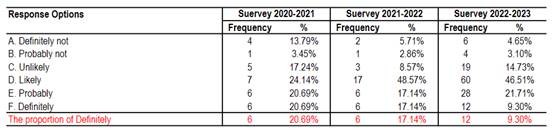 The surveys in 2021, 2022, and 2023 involved 29, 35, 129participants respectively, and included 55 questions covering various aspectssuch as the overall impression of the school, school ethos and academicatmosphere, student management, educational environment, teacher ethics andteaching style, as well as family background. The survey targeted parents ofcurrent students at our school, and the parents took this survey seriously andprovided significant support. All survey questionnaires were collected inAugust 2021, March 2022, January 2023, effectively achieving the objectives ofthe survey. The questionnaire was composed of two main parts. The first partconsisted of family background information, including 12 questions about thestudent's gender, grade, parents' level of education, family annual income, andsoon. The second part focused on parents' satisfaction with various activitiesat the school, comprising 43 questions with five options: very satisfied,satisfied, somewhat satisfied, dissatisfied, and very dissatisfied. Thefollowing will provide a detailed analysis of the questionnaire structure.