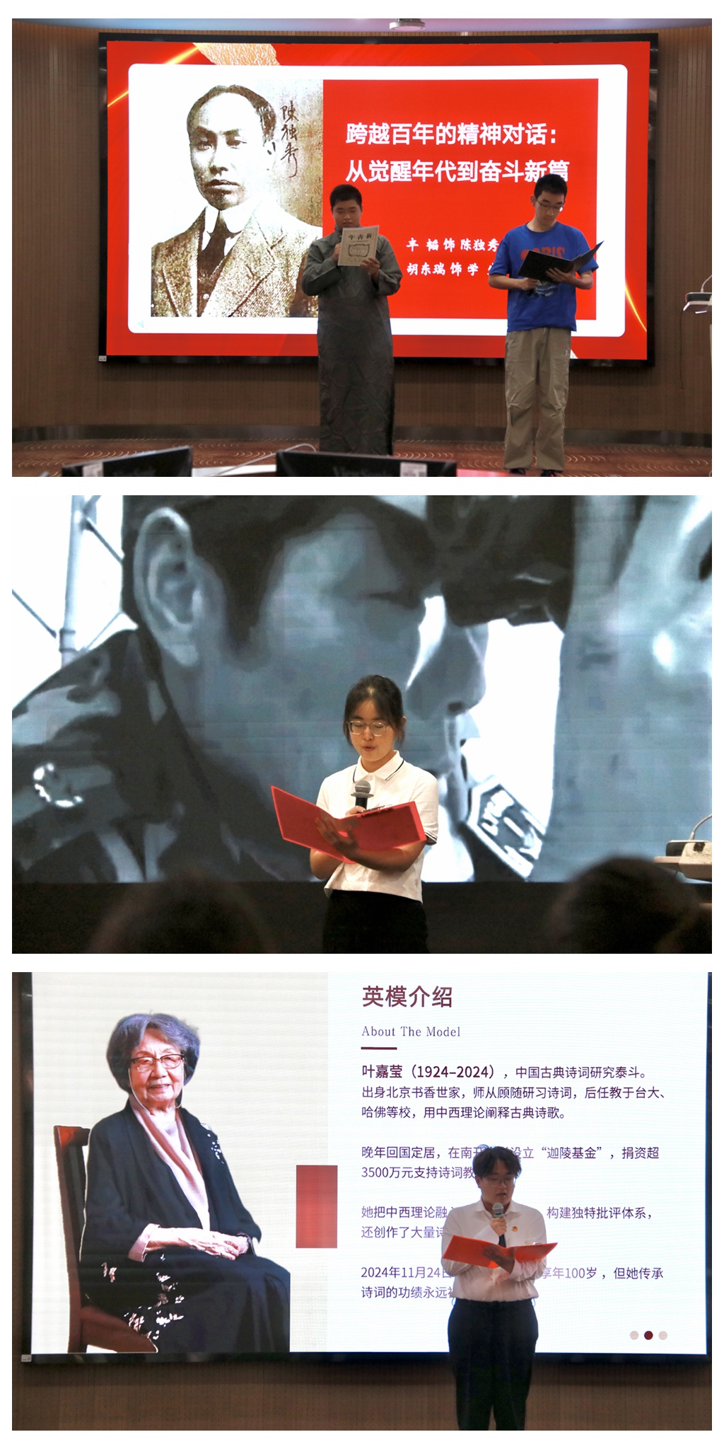 The event commenced with a themed recitation titled Letters to Heroes and Models. Three groups of trainee representatives expressed heartfelt tributes to exemplary figures from different fields. Feng Tao and Hu Dongrui presented Echoes of Awakening: A Century-Old Dialogue Between Youth and Their Era, passionately reenacting the historic exchange between young pioneers and their times a hundred years ago, showcasing the revolutionary predecessors’ unwavering dedication to their ideals. Xue Huiyi’s recitation Seeking Light, Becoming Light, Spreading Lighteloquently illustrated how contemporary youth inherit and practice the spirit of role models, calling on attendees to embrace their mission in the pursuit of excellence. Zhao Liang’s Dedicating My Heart to the Yao Qin—To Ye Jiaying, Guardian of Classical Poetrypaid poetic homage to the renowned master of classical poetry studies, Madam Ye Jiaying, interpreting her perseverance and cultural devotion.